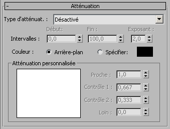 - Distance, en unités universelles, à laquelle l'atténuation débute. Valeur par défaut : 0,0.