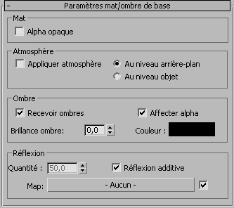 Les contrôles de cette zone déterminent si les surfaces mates peuvent avoir des réflexions ou pas. Pour créer des réflexions mates, vous devez utiliser une map ombre.