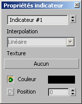 En définissant les paramètres de la boîte de dialogue Propriétés indicateur, vous pouvez personnaliser l'effet de chaque indicateur dans la map Rampe dégradé. Cette boîte de dialogue vous donne accès à tous les indicateurs.
