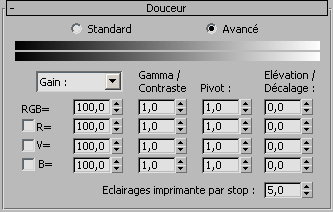 La correction gamma s'applique autour d'une valeur de pivot. Les valeurs de pixel égales à la valeur de pivot restent donc inchangées. Il est utile lorsque vous voulez utiliser une correction gamma de changer le contraste d'une map mais que vous ne voulez pas affecter un niveau de luminance spécifique.