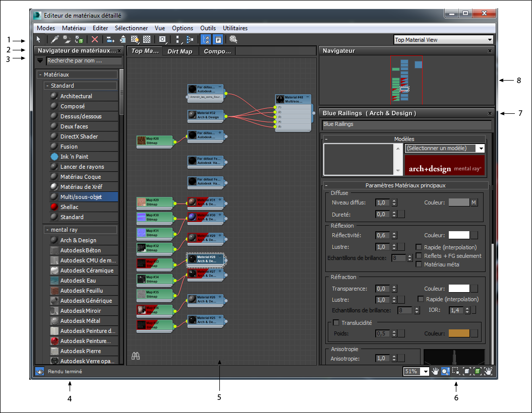 L'interface Ardoise est une interface graphique composée de plusieurs éléments. Les plus importants sont le Navigateur de matériaux/maps, dans lequel vous pouvez rechercher des matériaux, des maps, ainsi que des types de matériau et de map de base ; la vue active, dans laquelle vous pouvez combiner des matériaux et des maps ; enfin, l'éditeur de paramètres, qui permet de modifier les paramètres de matériau et de map.