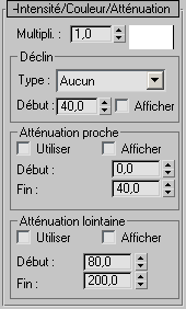 Deux jeux de valeurs contrôlent l'atténuation des objets. La valeur Atténuation lointaine définit la distance à laquelle l'éclairage doit diminuer jusqu'à l'intensité zéro. La valeur Atténuation proche définit la distance à laquelle la lumière "apparaît en fondu". Ces deux commandes sont activées et désactivées par une bascule appelée Utiliser.