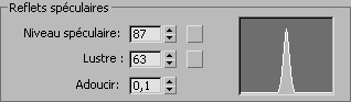 Cela a pour effet de modifier l'intensité de la courbe du reflet ainsi que les reflets dans l'aperçu. Lorsque le niveau spéculaire est égal à 0 %, il n’y a aucun reflet. Lorsqu'il est égal à 100 %, la courbe atteint sa hauteur maximale, sans surcharge. Si les valeurs sont supérieures à 100 %, la courbe est surchargée : elle s'élargit et une plus grande zone a une intensité de reflet maximum.