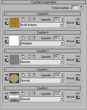 Les commandes d'une map Composé incluent la liste des maps combinées ainsi qu'un mode de fusion, un paramètre d'opacité, et un masque pour chacune.