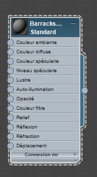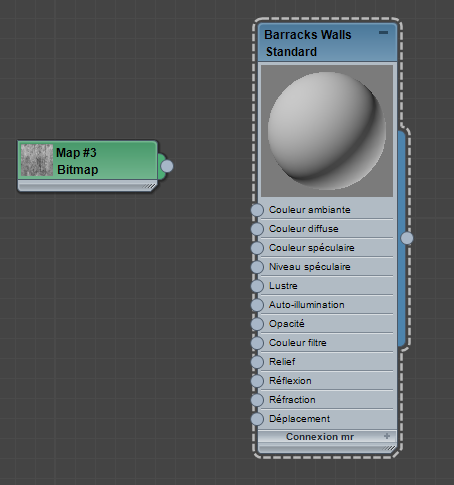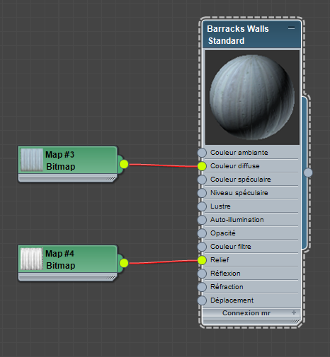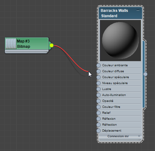 Lorsque vous déposez la ligne de relation sur le connecteur d'entrée Couleur diffuse, cette map est appliquée au composant de couleur diffuse du matériau.