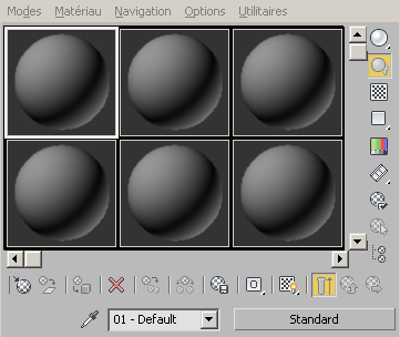 La barre de menus se trouve au-dessus des champs échantillons. Au-dessous et à droite des champs échantillons figurent des boutons et d'autres commandes que vous pouvez utiliser pour gérer et modifier les maps et les matériaux.