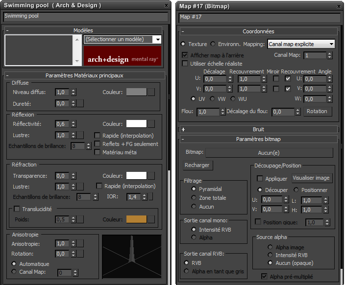 Gauche : commandes d'un noeud de matériau dans l'Editeur de paramètres