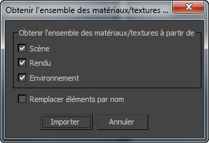 Lorsque vous sélectionnez cette option, 3ds Max ouvre la boîte de dialogue Obtenir l'ensemble des matériaux/textures de la scène.