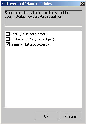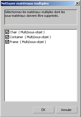 La boîte de dialogue affiche une liste de tous les matériaux multi/sous-objet qui contiennent des sous-matériaux non affectés. Tous les matériaux multi/sous-objet sont automatiquement activé. Ils peuvent ensuite être effacés.