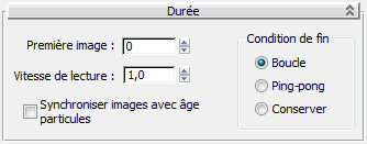 Ces commandes vous permettent de modifier l'heure de début ainsi que la vitesse des fichiers d'animation (AVI ou MOV) utilisés en tant que maps de texture animées. Elles simplifient grandement l'utilisation des séquences d'images dans les scènes, car elles vous permettent de contrôler la synchronisation avec précision.