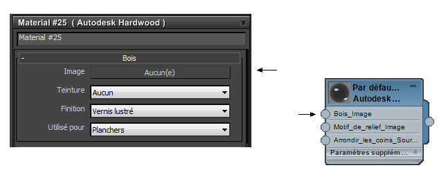 Le composant Base Hardwood mappable (sur la gauche) s'affiche en tant que champ Base Hardwood dans le noeud de matériau (sur la droite).