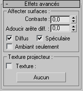 Le panneau déroulant Effets avancés contient des commandes permettant de modifier les effets des lumières sur les surfaces, ainsi qu'un certain nombre de paramètres de configuration des lumières de projecteurs.