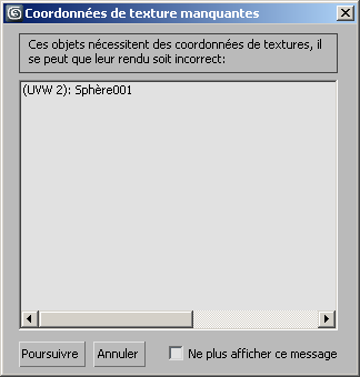 La boîte de dialogue Coordonnées de map manquantes s'affiche lorsque vous tentez de rendre un ou plusieurs objets avec des matériaux dont les maps utilisent un canal de map autre que le canal 1. (le canal 1 est une exception car les coordonnées de mapping du canal 1 sont automatiquement activées lorsque vous attribuez un matériau mappé à un objet). Seules les maps dont l'option Afficher le mapping dans la fenêtre est activée sont indiquées comme manquantes.