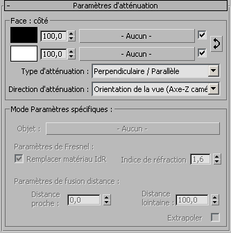 Remarque : Lorsque d'anciens fichiers qui utilisent les textures Atténuation sont importés dans 3ds Max, l'ancienne interface Atténuation apparaît, remplaçant la nouvelle interface Atténuation.