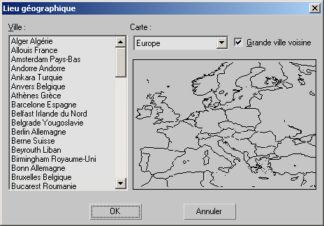 Affiche une liste des villes figurant dans la région sélectionnée dans la carte. Vous pouvez sélectionner une ville directement dans cette liste, au lieu de cliquer sur la carte. La croix sur la carte se place sur la ville sélectionnée.