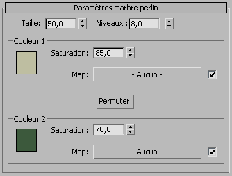 La texture Marbre Perlin, fondée sur l'algorithme de turbulence Perlin, génère un motif marbré. Cette map peut remplacer la map Marbre, qui est également un matériau 3D.