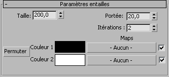 Permettent de choisir une combinaison de deux couleurs pour un composant de couleur (dans le cas d'une map diffuse, par exemple). Valeurs par défaut : noir pour la Couleur 1 et blanc pour la Couleur 2.