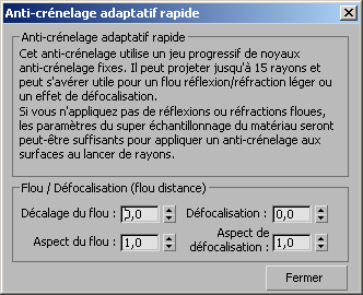 La boîte de dialogue Anti-crénelage adaptatif rapide modifie les paramètres du matériau Lancer de rayons et mappe l'outil d'anti-crénelage adaptatif rapide. Vous pouvez utiliser cette boîte de dialogue soit globalement, à partir du panneau déroulant Paramètres globaux du lanceur de rayons, soit localement, à partir du panneau déroulant Commandes du lanceur de rayons. Lorsque vous modifiez les paramètres d'un outil anti-crénelage localement, ses paramètres globaux demeurent inchangés.