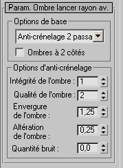 Anti-crénelage 2 passages (valeur par défaut) Projette deux séries de rayons. La première série de rayons détermine si le point en question est entièrement éclairé, ombré ou dans la pénombre (zone adoucie) de l'ombre. Si le point est dans la pénombre, une série de rayons secondaires est projetée pour affiner l'arête. Le nombre initial de rayons est spécifié via la case fléchée Intégrité de l'ombre. Le nombre de rayons secondaires est spécifié via la case fléchée Qualité de l'ombre.