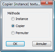La boîte de dialogue Copier (instance) map s'ouvre lorsque vous copiez une map en faisant glisser-déplacer un bouton de map. Cela vous donne la possibilité de copier la map, faisant de la map nouvellement attribuée une instance de celle que vous avez fait glisser, ou interchangeant les maps.