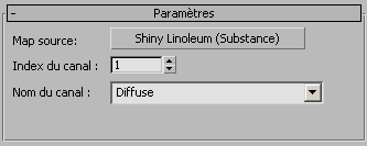 Canal de sortie de la map Substance. Modifiez le canal en en choisissant un autre dans la liste déroulante. Ce paramètre est lié au paramètre Index du canal (voir ci-dessus).