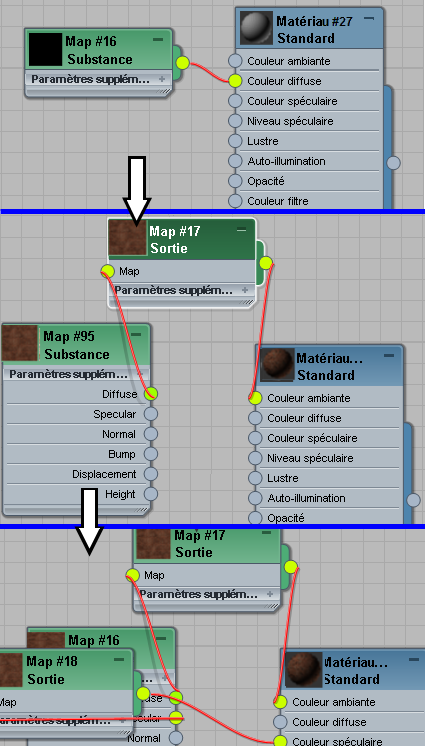 En bas : une seconde map Sélecteur de sortie de la map est insérée après qu'une autre connexion (Spéculaire) a été établie entre la map Substance et le matériau.