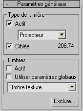 Ce panneau déroulant Paramètres généraux s'affiche pour les lumières standard. Ces commandes permettent d'activer ou de désactiver une lumière et d'exclure ou d'inclure des objets de la scène.
