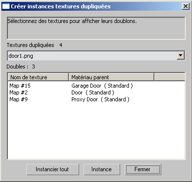 Lorsque vous sélectionnez une texture dans la liste Textures dupliquées, 3ds Max affiche ses doublons dans la liste Doubles, qui présente les noms des textures et les noms des matériaux parent. Le nombre après " Doubles " indique le nombre de copies trouvées dans la scène. Les textures de cette liste peuvent être sélectionnées individuellement. Seuls les doublons sélectionnés dans cette liste seront consolidés dans l'instance finale si vous cliquez sur le bouton Instance. L'instance créée prend le nom du premier doublon sélectionné dans la liste.
