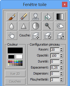 Cette section initiale décrit les commandes de la partie supérieure de la boîte d dialogue Fenêtre toile : outils de peinture, paramètres du pinceau et des couleurs, et boutons permettant d'ouvrir une vue 2D et la boîte de dialogue Couches. Les autres commandes sont disponibles dans des groupes de fonctions distincts de la boîte de dialogue et sont décrites dans la rubrique Panneaux déroulants supplémentaires Fenêtre toile.