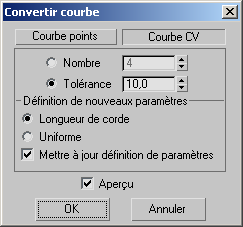 - Lorsque cette option est activée, 3ds Max calcule le nombre de CV. Elle reconstitue la courbe en fonction de la précision. Plus la valeur de la tolérance est faible, plus la reconstitution sera précise. L’augmentation de la tolérance permet de reconstituer la courbe en utilisant moins de CV.