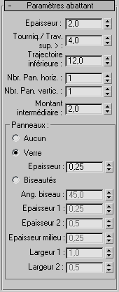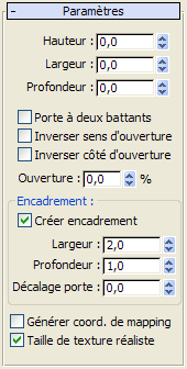 Paramètre Ouverture sur la position d'ouverture de la porte au début de l'animation. Si vous voulez qu'elle soit fermée, utilisez la valeur 0. Les rubriques correspondant à chaque type de porte décrivent les commandes et le comportement caractéristique de chacune de celles-ci. La plupart des paramètres de portes sont communs à tous les types de portes et sont décrits dans ces rubriques.