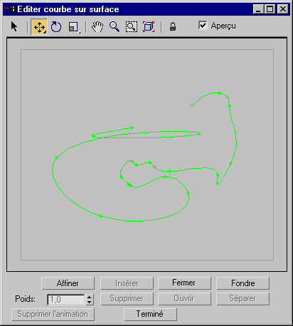 Avec cette boîte de dialogue, l'édition de courbes sur des surfaces s'effectue de la même manière que l'édition de courbes régulières dans une fenêtre. La partie principale de la boîte de dialogue présente une vue bi-dimensionnelle de la surface. Les commandes proposent les principales fonctions d'édition de courbes.