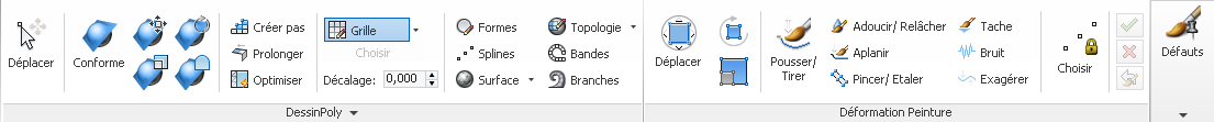 Ce groupe de fonctions contient des outils permettant d'ébaucher et de modifier un maillage sur la grille principale, projeté sur la surface d'un autre objet ou sur l'objet sélectionné lui-même, en fonction du paramètre Dessiner sur. DessinPoly propose également l'option Conformer les outils pour mouler un objet à la forme d'un autre.