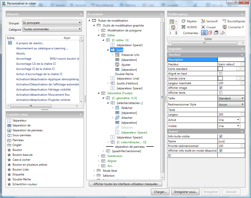 La boîte de dialogue Personnaliser le ruban offre un grand nombre d'outils permettant de modifier le ruban. Vous pouvez utiliser la souris ou le clavier pour réorganiser les contrôles existants, les renommer et en modifier les icônes. De plus, vous pouvez ajouter des contrôles basés sur la plupart des outils de 3ds Max, ainsi que de nouveaux outils créés à partir de scripts personnalisés.