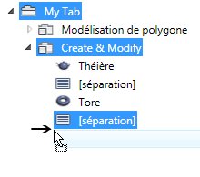 7. A partir de la liste Contrôles ruban, faites glisser l'élément Séparation de entre les entrées Théière et Tore de la liste IU existante.