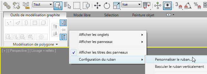 Conseil : Pour créer un ruban personnalisé entièrement nouveau, supprimez les onglets existants, ajoutez un ou plusieurs nouveaux onglets, puis configurez-les selon vos préférences. Notez toutefois qu'un seul ruban peut être actif à la fois dans 3ds Max. Par conséquent, il est conseillé d'enregistrer votre ruban personnalisé sous un nouveau nom de fichier et de charger ce ruban personnalisé ou celui d'origine selon vos besoins. Si vous devez restaurer le ruban par défaut, utilisez la commande Réinitialiser le ruban.