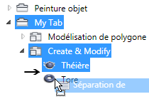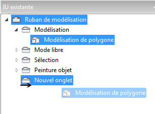 9. Appuyez sur la touche Maj et maintenez-la enfoncée, puis faites glisser l'élément Modélisation de polygone de la liste IU existante (sous Outils de modélisation graphite) et déposez-le juste en dessous de l'élément Mon onglet. Avant de relâcher le bouton de la souris, assurez-vous qu'une icône + apparaît sur le curseur, comme indiqué dans l'illustration suivante.