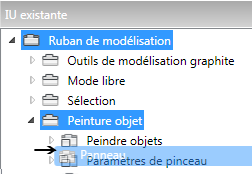 Lorsque vous déplacez la souris sur la liste IU existante, une flèche indique l'endroit où l'élément que vous faites glisser sera déposé lorsque vous relâcherez le bouton de la souris. Si vous vous arrêtez quelques secondes sur un élément pouvant être développé, son arborescence est développée, de sorte que vous pouvez y déposer l'élément déplacé. Ce n'est pas souhaitable dans le cas présent, et vous devez donc veiller à relâcher le bouton de la souris avant que l'arborescence de Peinture objet soit développée. Si elle se développe malgré tout, relâchez le bouton de la souris (aucun élément ne sera probablement ajouté), fermez l'arborescence et réessayez.
