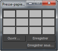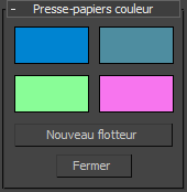 Affiche un presse-papiers flottant composé de 12 champs, ainsi que des boutons permettant d'ouvrir et d'enregistrer des fichiers du presse-papiers couleur. Vous pouvez ouvrir autant de flotteurs que vous le désirez et les réduire. Si vous quittez le groupe de fonctions Utilitaires ou sélectionnez le bouton Fermer pour quitter l'utilitaire Presse-papiers couleur, tous les flotteurs visibles restent ouverts. Lorsque vous fermez un flotteur, toutes les valeurs modifiées sont perdues.