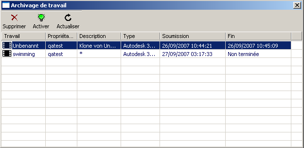 La liste des travaux affiche le nom du travail, le propriétaire, la description, le type (plug-in du rendu), la date de soumission d'origine et la date de fin. A l'inverse des autres listes du moniteur de file d'attente, vous ne pouvez pas ajouter ou supprimer des colonnes. Vous pouvez faire une sélection multiple de travaux en maintenant les touches Majou Ctrl enfoncées.