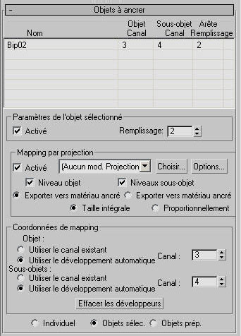 - Objets prép.cette liste affiche tous les objets visibles et dégelés de la scène (qu'ils soient sélectionnés ou pas) auxquels est appliquée une texture développée.