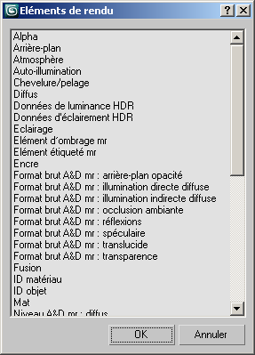 Menu Rendu > Configuration du rendu > Boîte de dialogue Configuration du rendu > Groupe de fonctions Eléments de rendu > Panneau déroulant Eléments de rendu > Bouton Ajouter > Boîte de dialogue Eléments de rendu