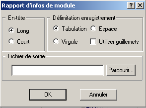 Spécifie le type de délimiteur utilisé entre les champs. Par exemple, si vous utilisez le délimiteur Tab, le rapport importera correctement vers les applications Microsoft Excel ou Access.