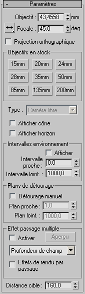 - Définit la distance focale de la caméra en millimètres. Utilisez la double flèche Objectif pour donner à la distance focale une valeur autre que les valeurs prédéfinies, c’est-à-dire les valeurs "en stock" indiquées sur les boutons de la zone de groupe Objectifs en stock.
