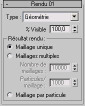 - Permet de générer le rendu de particules sous la forme de boîtes englobantes ou de géométrie, de désactiver le système de particules au moment du rendu ou, enfin, d'activer le système de particules tout en l'empêchant d'envoyer vers l'outil de rendu de 3ds Max des particules pouvant être rendues. La valeur par défaut est Géométrie.