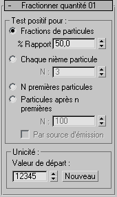 La zone Unicité permet d'activer la randomisation de la rétention de particules à l'aide de l'option Fractions de particules.