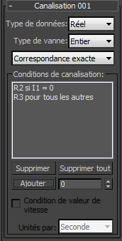 La zone de liste de la zone Conditions de canalisation affiche les conditions utilisées pour déterminer l'entrée de données qui est transmise. Pour tous les types de vannes à l'exception de Booléen, il s'agit d'intervalles basés sur des valeurs que vous spécifiez. Par défaut, si le type de vanne n'est pas Booléen, il y a une seule condition (et une seule entrée), laquelle est définie sur Tout, ce qui signifie que les données d'entrée sont simplement transmises. Le bouton Ajouter permet d'ajouter d'autres conditions.