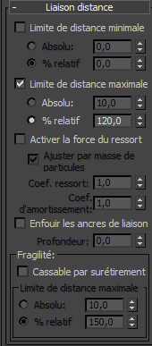 La modification de ce paramètre n'affecte pas les distances entre les particules au moment de la liaison, mais, si vous augmentez la limite, les particules peuvent s'écarter davantage lorsqu'elles sont soumises à des forces extérieures tout en restant liées.