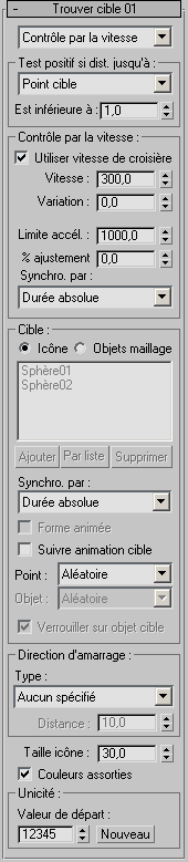 Lorsque vous ajoutez un test Trouver cible à un système de particules dans Vue particule, une icône sphérique Trouver cible, ou un assistant, apparaît dans la scène au niveau de l'origine universelle (0,0,0). Vous pouvez utiliser cette icône (ou un ou plusieurs objets maillage de la scène) comme cible. Pour afficher les paramètres Trouver cible dans le groupe de fonctions Modifier, sélectionnez l'icône. Si vous supprimez cette icône, Particle Flow supprime également le test.