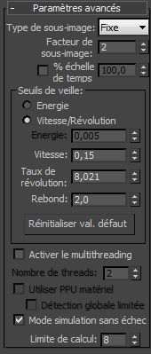Remarque : Selon la complexité de la scène, il n'est pas toujours possible de répartir la simulation entre plusieurs processeurs. Dans ce cas, l'utilisation du multithreading peut entraîner un ralentissement des performances.